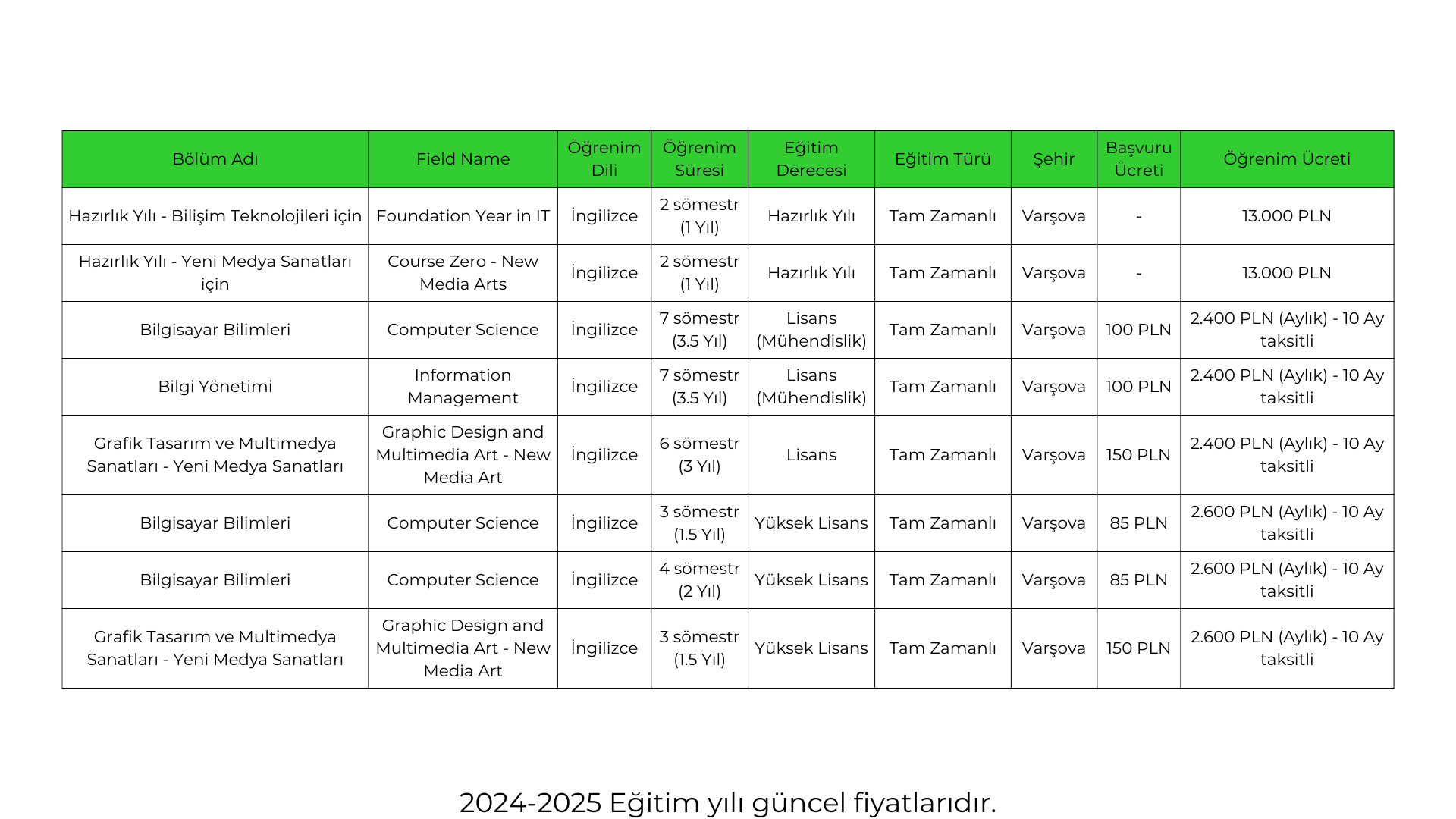 Polonya-Japonya Bilgi Teknolojileri Üniversitesi (Polish-Japanese Academy of Information Technology – PJAIT), Polonya’da teknoloji ve bilgisayar bilimleri alanında önde gelen özel üniversitelerden biridir. 1994 yılında Polonya ve Japonya hükümetleri işbirliğiyle kurulmuştur. Üniversite, Varşova’da merkezi bir konumda yer alır ve bilgisayar bilimi, bilgi yönetimi, grafik tasarım gibi alanlarda teorik ve pratik eğitimler sunar. Modern laboratuvarlar ve tarihi mimarisiyle dikkat çeken üniversite, öğrencilerine lisans, yüksek lisans ve doktora düzeyinde geniş bir yelpazede eğitim imkânı sağlamaktadır. Aşağıda, okulda sunulan bölümler ve bu bölümlerin ücretleriyle ilgili genel bilgiler yer almaktadır. Ancak, bölümler, ücretler ve diğer akademik bilgiler her yıl değişiklik gösterebilir. Bu nedenle, sitemizdeki bilgiler yalnızca genel bilgilendirme amaçlıdır ve güncelliği konusunda garanti verilmemektedir. Kesin ve güncel bilgiler için üniversitelerin resmi web sitelerini ziyaret edebilir veya bizimle iletişime geçebilirsiniz.Polonya-Japon Bilgi Teknolojileri Üniversitesi Lisans/Yüksek Lisans Bölümleri ve Ücretleri
