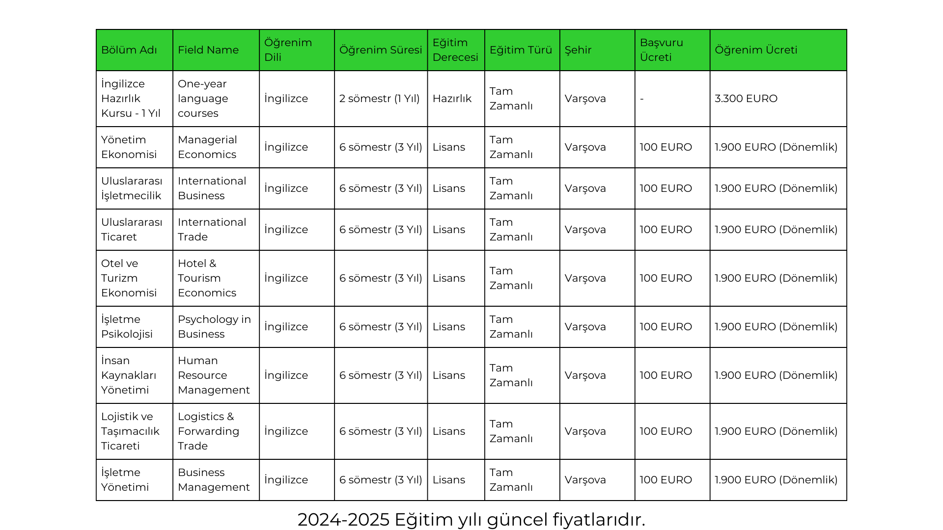 Varşova Ekonomi Üniversitesi Lisans Bölümleri ve Ücretleri