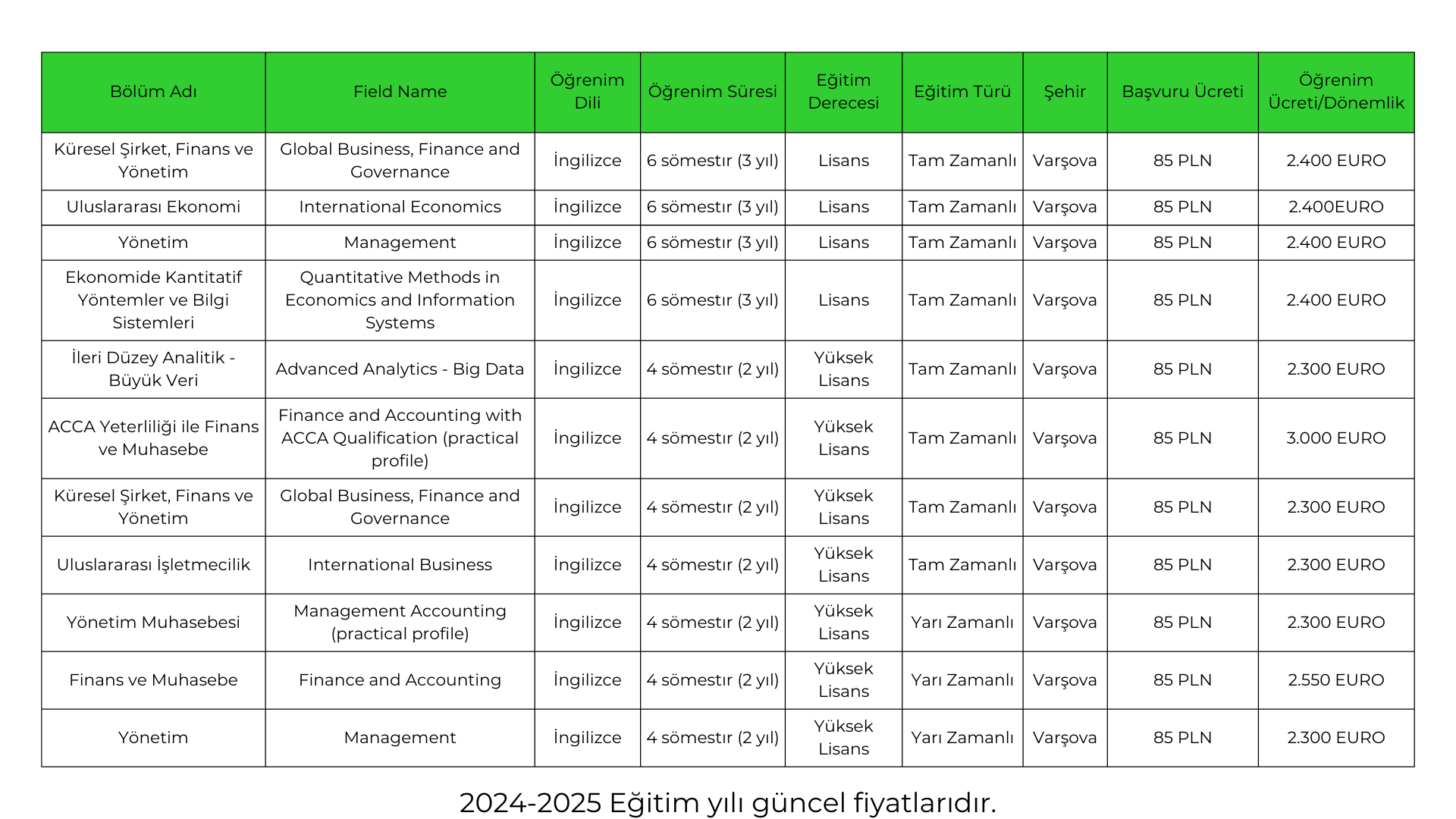 Varşova SGH Ekonomi Üniversitesi Lisans/Yüksek Lisans Bölümleri ve Ücretleri